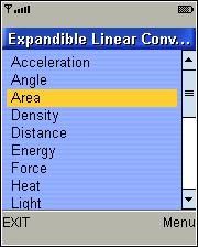 - When the program starts it displays a list of types of conversions (Acceleration, Angle, Area…) as shown in the image.