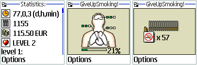 Publisher’s description: “Give Up Smoking!” is a freeware “tamagotchi style” application designed for java enabled mobile phones. The main purpose of the application is to help people trying to quit smoking to achieve the goal. The application encourages the user to gain successive body purification levels allowing browsing statistics, providing visualizations and descriptions of positive changes that have occurred in the body since quitting smoking. The progress of body purification process is calculated every minute basing on data provided by user (start date, average number of cigarettes smoked daily and cigarette pack price).