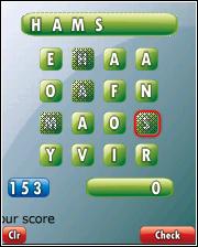 Keys: arrows, 2, 4, 6 = move cursor; OK, 5, Call = select highligted letter; Right softkey (labeled “Check”) = use word; Left softkey = clear current word; * = Menu; # = get different scrambled letters